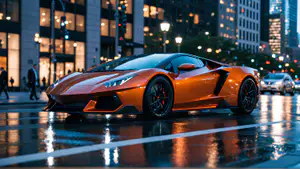 Een vurig oranje supercar met zwarte velgen en agressieve aerodynamische lijnen staat geparkeerd op een glimmend nat wegdek in een levendige metropool bij avond. De stadslichten reflecteren perfect in het regenachtige asfalt, terwijl op de achtergrond verlichte wolkenkrabbers en winkeletalages een stijlvolle urbane setting creëren.