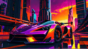 Deze opvallende paarse hypercar met oranje en gele accenten domineert de futuristische stadsweg in een levendige cyberpunk wereld. De agressieve vormgeving met scherpe hoeken en een imposante achtervleugel wordt versterkt door de neon verlichting. De achtergrond toont een indrukwekkende toekomststad met gigantische wolkenkrabbers onder een dramatische zonsondergang in roze en oranje tinten, die alles in een synthwave-esthetiek hult.