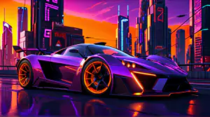 Deze opvallende paarse hypercar met futuristische lijnen pronkt met zijn glanzende metallic lak en contrasterende oranje velgen op een regenachtige cyberpunk straat. De aerodynamische carrosserie met agressieve hoeken en LED-verlichte accenten weerspiegelt perfect in het natte wegdek. Op de achtergrond vormen gigantische wolkenkrabbers met neonreclames een dramatische skyline tegen een vurige oranje-paarse zonsondergang, typisch voor de retrofuturistische synthwave-stijl.