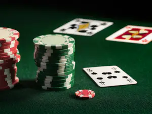 Sfeervolle close-up van een klassieke pokertafel met gestapelde fiches in rood en groen tegen een donkergroene achtergrond. Verspreid liggende speelkaarten completeren deze authentieke casino-setting. perfect voor artikelen over casinospelen, gokken of entertainment.