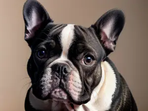 Expressieve close-up van een Franse Bulldog met kenmerkende vleermuisoren en zwart-witte vacht. De studio-opname toont de karakteristieke gelaatstrekken van dit populaire hondenras, met een zachte bruine achtergrond die de markante gezichtsuitdrukking perfect accentueert. perfect voor dierenliefhebbers en hondenkenners.