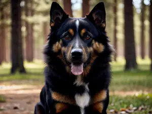 Expressief portret van een prachtige herdershond met karakteristieke zwart-bruine vacht, gefotografeerd in een sfeervol dennenbos. De scherpe close-up toont de intelligente blik en vriendelijke uitstraling van deze trouwe viervoeter. perfect voor dierenliefhebbers, hondentrainers of natuurfotografie.