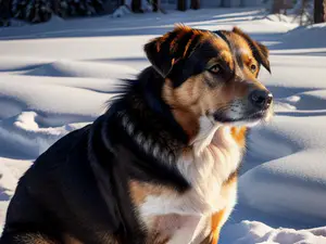 Sfeervolle winterfoto van een attente driekleurige hond in een besneeuwd landschap. De warme tinten van de vacht contrasteren prachtig met de witte sneeuw, terwijl het dier alert de omgeving observeert. perfect voor content over huisdieren, winterse natuurfotografie of dierenportretten.