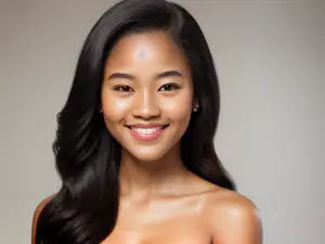 Stralend portret in studioverlichting met zachte grijze achtergrond. De natuurlijke make-up en glanzend zwart haar creëren een tijdloze uitstraling. perfect voor beauty campagnes, lifestyle magazines of professionele portfolio's. De warme glimlach en elegante pose stralen zelfvertrouwen uit.