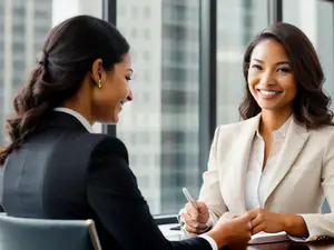 Professionele zakelijke ontmoeting in een moderne vergaderruimte met glazen wanden en stedelijk uitzicht. De sfeervolle setting straalt professionaliteit en vertrouwen uit, perfect voor zakelijke content over recruitment, coaching of bedrijfscommunicatie. De stijlvolle blazers en verzorgde uitstraling benadrukken de zakelijke context.
