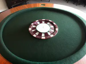 Luxe ronde pokertafel met karakteristieke groene viltbekleding en houten rand. De tafel is voorzien van een centrale kaarthouder in rood-wit design, perfect voor thuiscasino's of recreatieruimtes. Het professionele ontwerp straalt kwaliteit uit en nodigt uit tot spannende pokeravonden.