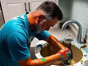 Vakkundige schilder maakt zijn verfgereedschap schoon in een wasbak na een schilderklus. De turquoise werkkleding toont kleurrijke verfspetters, wat de authenticiteit van het ambachtelijke schilderwerk benadrukt. Een realistische momentopname van de dagelijkse praktijk in het schildersvak.