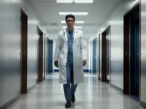 Professionele ziekenhuisgang met medisch specialist in witte jas AI-gegenereerd