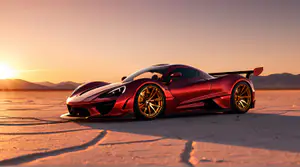 Een schitterende robijnrode supercar met opvallende gouden velgen en aerodynamische lijnen staat op de gebarsten oppervlakte van een uitgestrekte zoutvlakte. De ondergaande zon werpt een adembenemende gouden gloed over het landschap, wat het metallic rood van de auto prachtig accentueert. De scherpe bergsilhouetten aan de horizon en het geometrische patroon van de zoutkorst creëren een perfecte compositie van natuurlijke en menselijke excellentie.