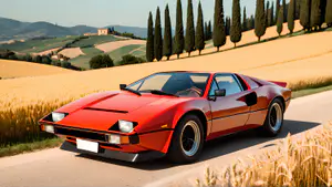 Een iconische rode retro sportwagen uit de jaren 80 staat elegant geparkeerd langs een landweg in het prachtige Toscaanse landschap. De klassieke supercar wordt omringd door gouden tarwevelden en karakteristieke cipressen die de glooiende heuvels sieren. Het warme avondlicht creëert een romantische en cinematografische sfeer die de tijdloze schoonheid van zowel de Italiaanse auto als het landschap benadrukt.