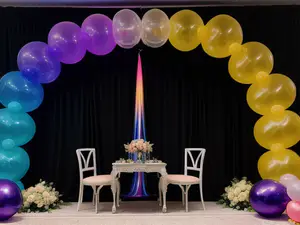 Sfeervolle feestlocatie met een elegante ballonnenboog in zachte regenboogkleuren, van turquoise tot geel. Centraal staat een vintage siertafel met twee witte stoelen, omlijst door romantische bloemstukken. De zwarte achtergrond creëert een dramatisch effect dat de kleurrijke decoratie extra laat spreken. perfect voor speciale gelegenheden en fo...