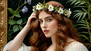 Sfeervolle portretfoto met een handgemaakte bloemenkrans van witte bloemen tegen een achtergrond van weelderig groen. De vintage setting wordt versterkt door een gouden lijst en zachte natuurlijke belichting. perfect voor bruidsinspiratie, lifestyle magazines en romantische concepten.