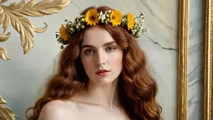 Artistiek portret met een handgemaakte bloemenkrans van gele zonnebloemen en witte bloesem. De zachte belichting en klassieke gouden lijst creëren een tijdloze sfeer. perfect voor bruidsfotografie, beauty campagnes of redactionele mode. De natuurlijke styling en warme tinten stralen romantiek uit.