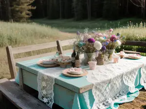 Sfeervolle gedekte tafel in rustieke buitensetting met mintgroene houten bank en vintage kanten tafelloper. Prachtig versierd met veldbloemen in glazen vaasjes, pastelkleurige servies en zoete lekkernijen. perfect voor een intieme tuinbruiloft, zomerfeest of romantische picknick in landelijke stijl.