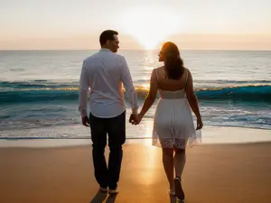 Sfeervolle strandwandeling tijdens het magische gouden uur, waar de warme zonsondergang het strand in een romantisch licht hult. De rustige golven en het goudkleurige zand creëren een perfect decor voor een intiem moment aan de kust. Ideaal voor thema's als romantiek, vakantie en ontspanning.