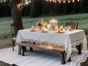 Sfeervolle buitentafel gedekt in landelijke stijl met wit kanten tafelkleed, rustieke houten bank en stoelen. Versierd met delicate bloemen, kaarsen en een decoratieve lantaarn. De lichtsnoeren zorgen voor een warme gloed in de avondschemering, perfect voor een romantisch diner of intieme tuinreceptie.