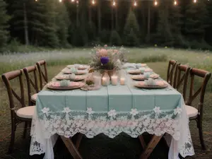 Sfeervolle gedekte tafel in de tuin met een elegant mint-kleurig tafelkleed, afgewerkt met romantisch kant. De vintage houten stoelen en warme lichtsnoeren creëren een intieme sfeer. perfect voor een buitendiner, tuinfeest of kleine bruiloft. De tafel is stijlvol gedekt met servies in pastelkleuren en versierd met verse bloemen.