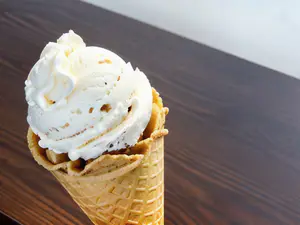 Verleidelijk zachte bol vanille-ijs met een romige textuur, gedrapeerd in een knapperige wafelhoorn. Het klassieke schepijs rust op een stijlvolle donkerhouten ondergrond, wat een perfect contrast vormt met het roomwitte ijs. Een tijdloze lekkernij die doet verlangen naar zomerse dagen.