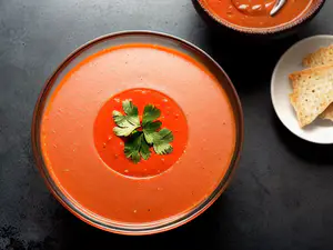 Fluwelige tomatensoep geserveerd in een stijlvolle glazen kom, gegarneerd met verse peterselie. De levendige oranje-rode kleur en romige textuur maken deze soep tot een uitnodigend gerecht. perfect voor een warme lunch of als smaakvol voorgerecht, geserveerd met knapperig brood. De soep straalt warmte en comfort uit.