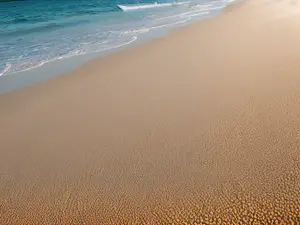 Sereen zeelandschap waar turquoise golven zachtjes het maagdelijke goudkleurige zand ontmoeten. De perfecte textuur van het ongerepte strand en het kristalheldere water creëren een rustgevende sfeer die het ultieme vakantiegevoel oproept. Ideaal voor reisbrochures, vakantiewebsites of wanddecoratie.