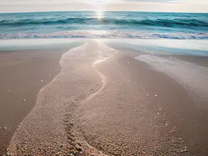 Sereen beeld van een verlaten zandstrand bij zonsopgang, waar de oceaangolven zachtjes het strand op rollen. Het turquoise water contrasteert prachtig met het goudbruine zand, terwijl de opkomende zon een zachte gloed over het landschap werpt. perfect voor sfeervolle wanddecoratie of reisbrochures.