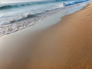 Sereen beeld van een ongerept zandstrand waar turquoise golven zachtjes op het goudkleurige zand rollen. De schuimende branding creëert een prachtig contrast met het gladde strand, perfect voor achtergronden of sfeervolle natuurfotografie. De vroege ochtendsfeer straalt rust en harmonie uit.