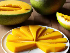Verleidelijke close-up van perfect gesneden galia meloen, gepresenteerd als goudgele partjes op een wit porseleinen bord. De sappige textuur en zoete rijpheid van de meloen zijn prachtig vastgelegd, met op de achtergrond de karakteristieke groen-gele schil. Ideaal voor content over gezonde voeding, zomerse gerechten of food styling.
