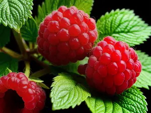 Weelderige macro-opname van rijpe, helderrode frambozen tegen een donkere achtergrond. De sappige vruchten worden omringd door karakteristieke heldergroene bladeren die perfect de natuurlijke frisheid benadrukken. Een sfeervolle compositie die perfect past bij thema's als gezonde voeding, biologische teelt en culinaire toepassingen.