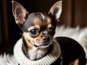 Expressief portret van een kleine Chihuahua met grote donkere ogen, gekleed in een warme witte gebreide coltrui. De zwart-bruine vacht contrasteert prachtig met de witte kleding. perfect voor content over huisdiermode, dierenverzorging of kleine hondenrassen. De close-up toont de karakteristieke gelaatstrekken van dit populaire hondenras.