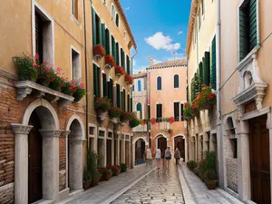 Betoverende smalle straat in Venetië met karakteristieke architectuur: crèmekleurige gevels, elegante boogarcades en groene luiken. De sfeervolle steeg wordt opgefleurd door rode bloemen in hangende potten, terwijl het warme zonlicht de klassieke Venetiaanse architectuur prachtig belicht. perfect voor reisbrochures, toeristische websites of inte...