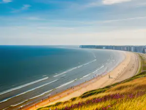 Panoramisch uitzicht over een uitgestrekt zandstrand aan de Belgische kust, gefotografeerd vanaf de duinen. De kromming van de kustlijn wordt geaccentueerd door moderne appartementengebouwen langs de boulevard. Het goudgele duingras op de voorgrond contrasteert prachtig met de azuurblauwe zee en hemel. perfect voor toeristische promotie of vastg...