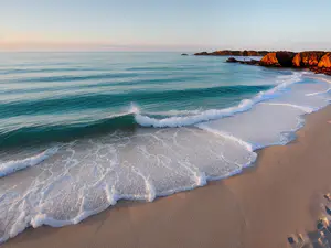 Adembenemend zeegezicht tijdens een serene zonsopgang, waar turquoise golven zachtjes het goudkleurige zandstrand strelen. De majestueuze rotsformaties worden in warme tinten verlicht, terwijl de branding een kant-achtig patroon op het strand achterlaat. Perfecte compositie voor wanddecoratie of promotioneel materiaal in de reis- en wellnessbran...
