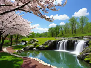Sereen lentepark met bloeiende kersenbloesem en natuurlijke waterval AI-gegenereerd