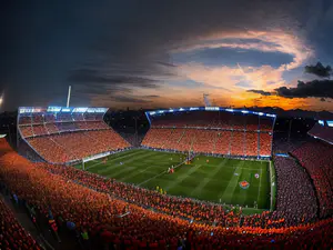Indrukwekkend stadionpanorama tijdens een avondwedstrijd, vastgelegd op het magische moment van zonsondergang. De tribunes zijn gevuld met duizenden supporters in oranje, terwijl de stadionlampen oplichten tegen een dramatische hemel met oranje-blauwe wolkenpartijen. De perfecte combinatie van sport, architectuur en natuurlijk licht creëert een ...