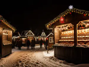 Betoverende avondopname van een traditionele wintermarkt met prachtig verlichte houten kraampjes in de sneeuw. De warme gloed van kerstverlichting en decoratieve lichtjes creëert een magische winterse sfeer. Bezoekers wandelen tussen de kraampjes door terwijl verse sneeuw het tafereel bedekt. perfect voor promotie van winterevenementen en kerstm...