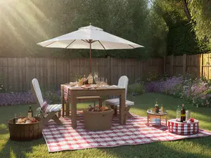 Idyllische picknickopstelling in een zonnige achtertuin met een klassiek roodwit geblokt kleed, houten tuintafel en comfortabele stoelen onder een stijlvolle witte parasol. De bloeiende borders en warme zonnestralen creëren een perfecte setting voor een ontspannen buitenlunch of zomerse borrel.