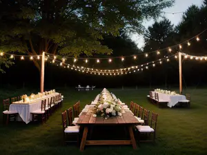 Stijlvolle buitenlocatie voor een intieme bruiloft, ingericht met rustieke houten tafels en warme sfeerverlichting. De lange dinertafels zijn sfeervol gedecoreerd met witte tafelkleden en bloemarrangementen. Kruisende lichtslingers zorgen voor een magische sterrenhemel effect in de avondlucht, perfect voor een romantisch tuinfeest.