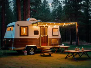 Sfeervol verlichte vintage caravan in een rustiek dennenbos tijdens de avondschemering. De klassieke bruinwitte caravan is stijlvol aangekleed met een warm lichtsnoer en heeft een gezellig terras met picknicktafels. perfect voor liefhebbers van nostalgisch kamperen en glamping in de natuur. De warme verlichting creëert een uitnodigende kampeersf...