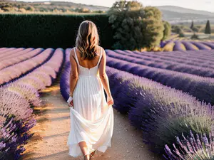 Sfeervolle opname van een witte zomerjurk tussen eindeloze rijen bloeiende lavendel tijdens het gouden uurtje. Het warme avondlicht valt prachtig op de paarse lavendelbloemen en creëert een romantische sfeer. perfect voor reisblogs, lifestyle content of promotie van zomermode en toerisme.