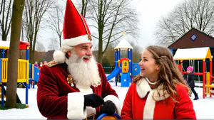 Sfeervolle winterse scène op een besneeuwd speelplein waar een traditioneel Nederlands kinderfeest plaatsvindt. De speeltuin met kleurrijke klimtoestellen vormt het decor voor een magisch decembermoment. Op de achtergrond zijn spelende kinderen te zien terwijl de sneeuw het tafereel een extra feestelijke uitstraling geeft.