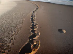Afbeeldingen - https://afbeeldingen.net/ai/slingerende-voetstappen-in-nat-zand-tijd-ad590c5