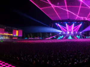 Adembenemende festivalsfeer vastgelegd tijdens een groots dance-evenement. De imposante lichtinstallatie met neonroze lasers creëert een futuristische atmosfeer boven de deinende menigte. Het hightech podiumontwerp met LED-schermen en dynamische lichteffecten zorgt voor een meeslepende visuele ervaring die kenmerkend is voor moderne Nederlandse ...