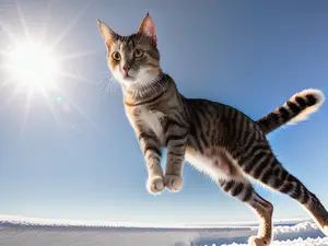 Dynamische foto van een gestreepte kat die elegant door de lucht springt tegen een strakblauwe winterhemel. De felle zon creëert een prachtig tegenlicht, terwijl de sneeuw op de achtergrond zorgt voor een sereen winterlandschap. perfect voor thema's rond huisdieren, winter en natuurfotografie.