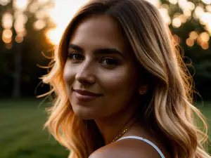 Sfeervol portret gefotografeerd tijdens het magische gouden uur, met warme zonnestralen die voor een natuurlijke gloed zorgen. De zachte bokeh-effecten op de achtergrond creëren een dromerige sfeer. perfect voor lifestyle magazines, mode-campagnes of social media content.