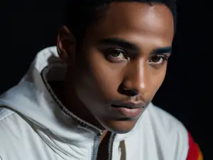 Artistiek portret met dramatische belichting tegen een donkere achtergrond. De witte sportkleding creëert een sterk contrast en moderne uitstraling. perfect voor mode-, sport- of lifestyle campagnes waar authenticiteit en stijl centraal staan. De professionele studiofotografie benadrukt details en texturen.