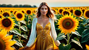 Sfeervolle modefoto in een uitgestrekt zonnebloemenveld tijdens het gouden uurtje. Een elegante gouden jurk met kraaltjes harmonieert prachtig met de bloemen, terwijl een witte chiffon cape zorgt voor een dromerige touch. De warme zonsondergang creëert een magisch spel van licht en schaduw tussen de zonnebloemen.
