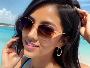 Trendy zomerbeeld met een stijlvolle zonnebril met goudkleurig montuur tegen een achtergrond van turquoise water en wit zandstrand. De gradient glazen en elegante hoepel oorbellen creëren een moderne vakantielook. perfect voor lifestyle en mode content.