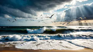 Adembenemend zeegezicht van woeste golven die op het strand rollen onder een dramatische wolkenlucht. Zonnestralen doorbreken de donkere wolken terwijl een groep zeemeeuwen sierlijk over de branding zweeft. De combinatie van ruige zee, gouden strand en mysterieus licht creëert een krachtige natuurimpressie.