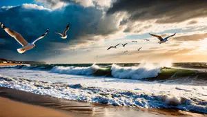 Dramatische natuurfoto van woeste golven die op het strand rollen tijdens zonsondergang. Zeemeeuwen zweven sierlijk boven de schuimende branding tegen een achtergrond van donkere en gouden wolken. perfect voor thema's als natuurkracht, vrijheid en de ruige schoonheid van de Nederlandse kust.