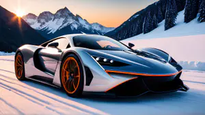 Spectaculaire zilvergrijze supercar met oranje accenten op een besneeuwd berglandschap tijdens zonsondergang. De zon piept net achter de besneeuwde bergtoppen terwijl de luxe sportwagen contrasteert met het winterse tafereel. Perfect als wallpaper voor uw smartphone of PC om dagelijks te genieten van deze adembenemende combinatie van automotive engineering en majestueuze natuurlijke pracht.